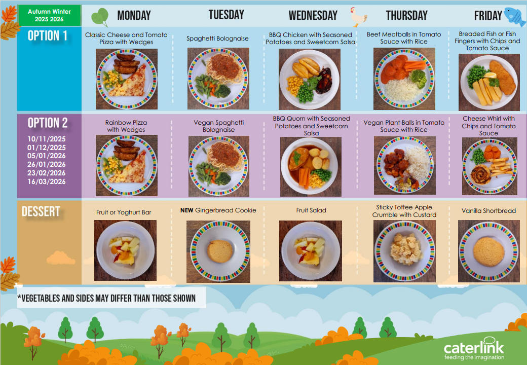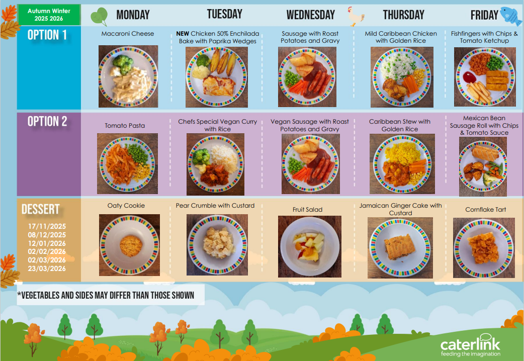 We offer all children the option of a hot school meal at lunchtimes, provided by our catering company, Caterlink.