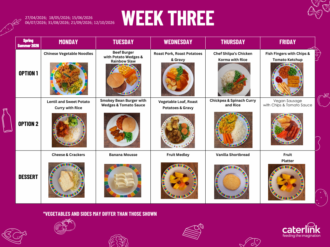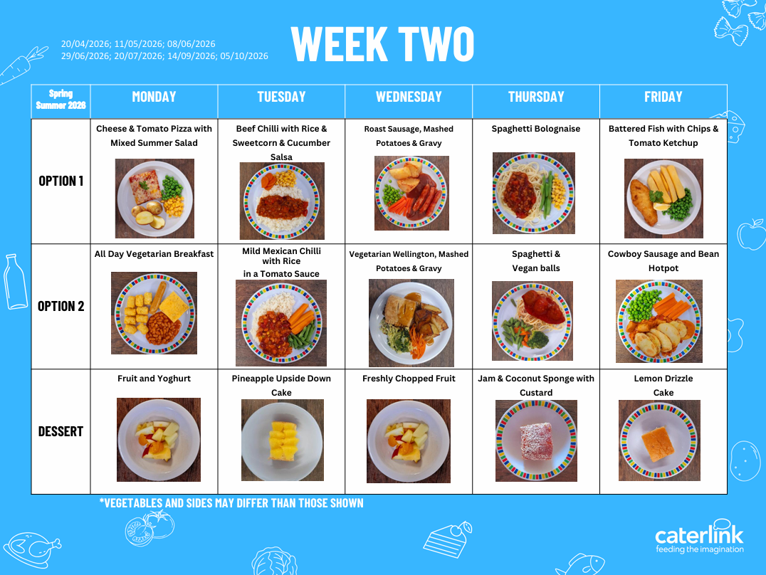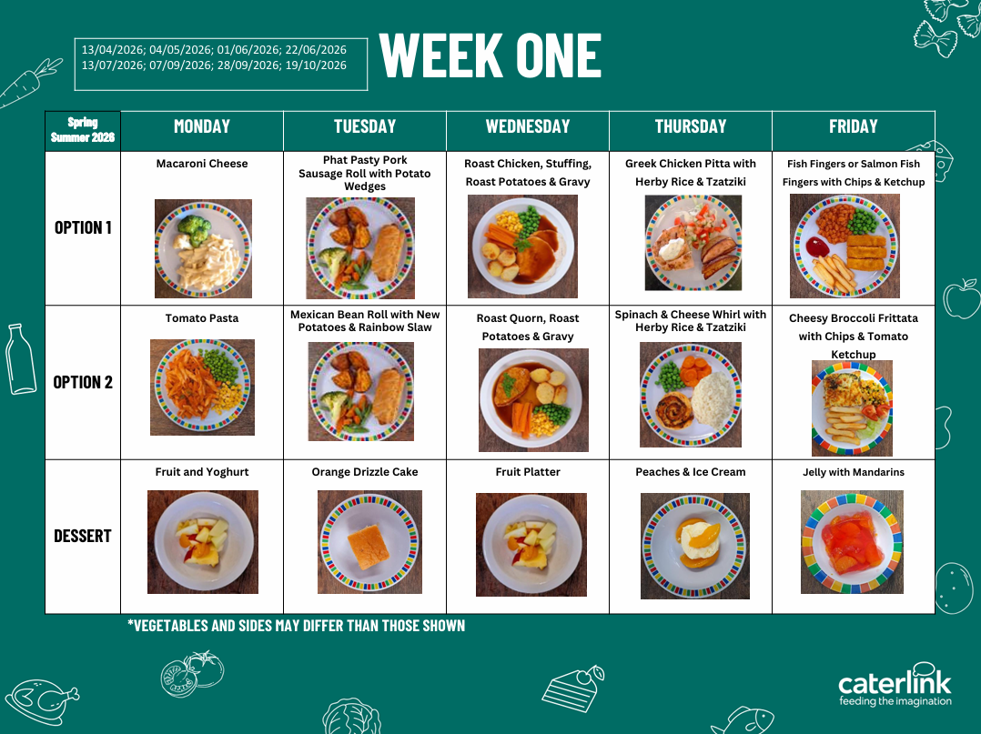 We offer all children the option of a hot school meal at lunchtimes, provided by our catering company, Caterlink.