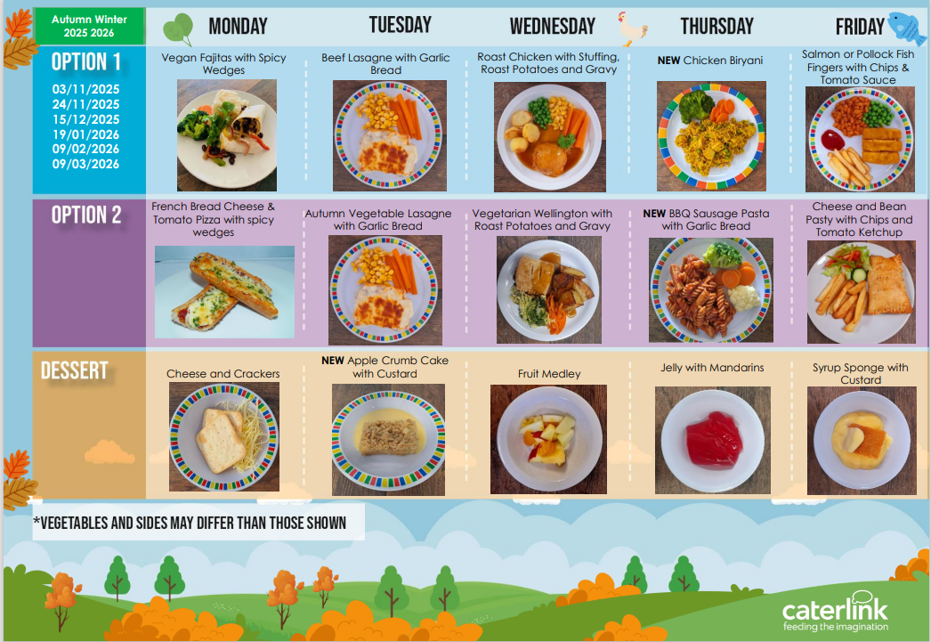 We offer all children the option of a hot school meal at lunchtimes, provided by our catering company, Caterlink.